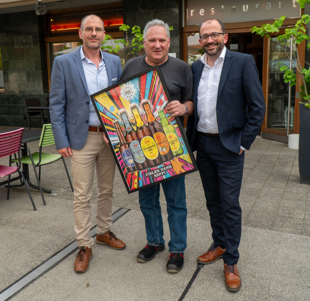 Wechsel im Verwaltungsrat der Hochdorf Bier AG. Adrian Nussbaum (rechts) verabschiedet Seppi Meier (Mitte) aus dem Verwaltungsrat und begrüsst Hansjörg Bucher (links).